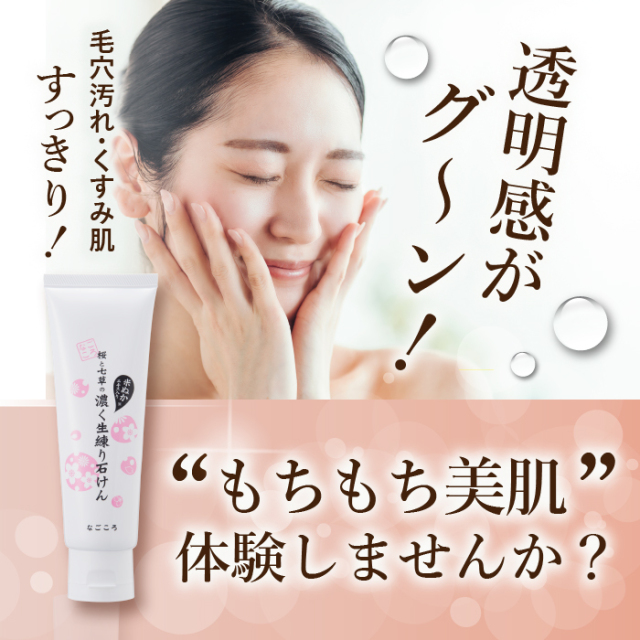 桜と七草の濃く生練り石鹸は、年齢による乾燥・開き毛穴が気になる方にオススメの高保湿練り石鹸。 ボリュームたっぷりキメ細かい保湿泡で毛穴汚れを取り除いた後の肌はもちもちのうるおい肌。